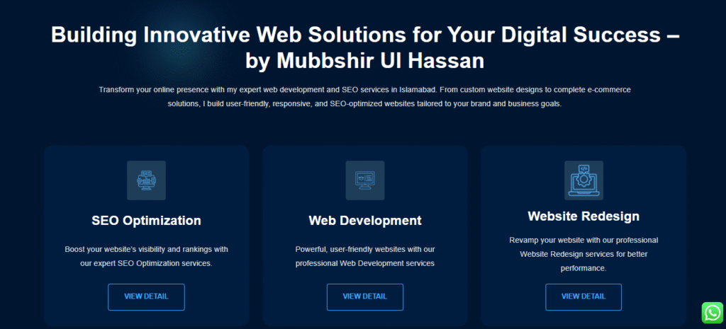 Mubbshir Ul Hassan, an experienced Web Developer and SEO Expert, sought to create a high-impact, professional personal branding website to showcase his extensive portfolio, specialized services (Web Development, SEO), and proven success rate. We designed and developed a site focused on conversion, credibility, and clear presentation of expertise.